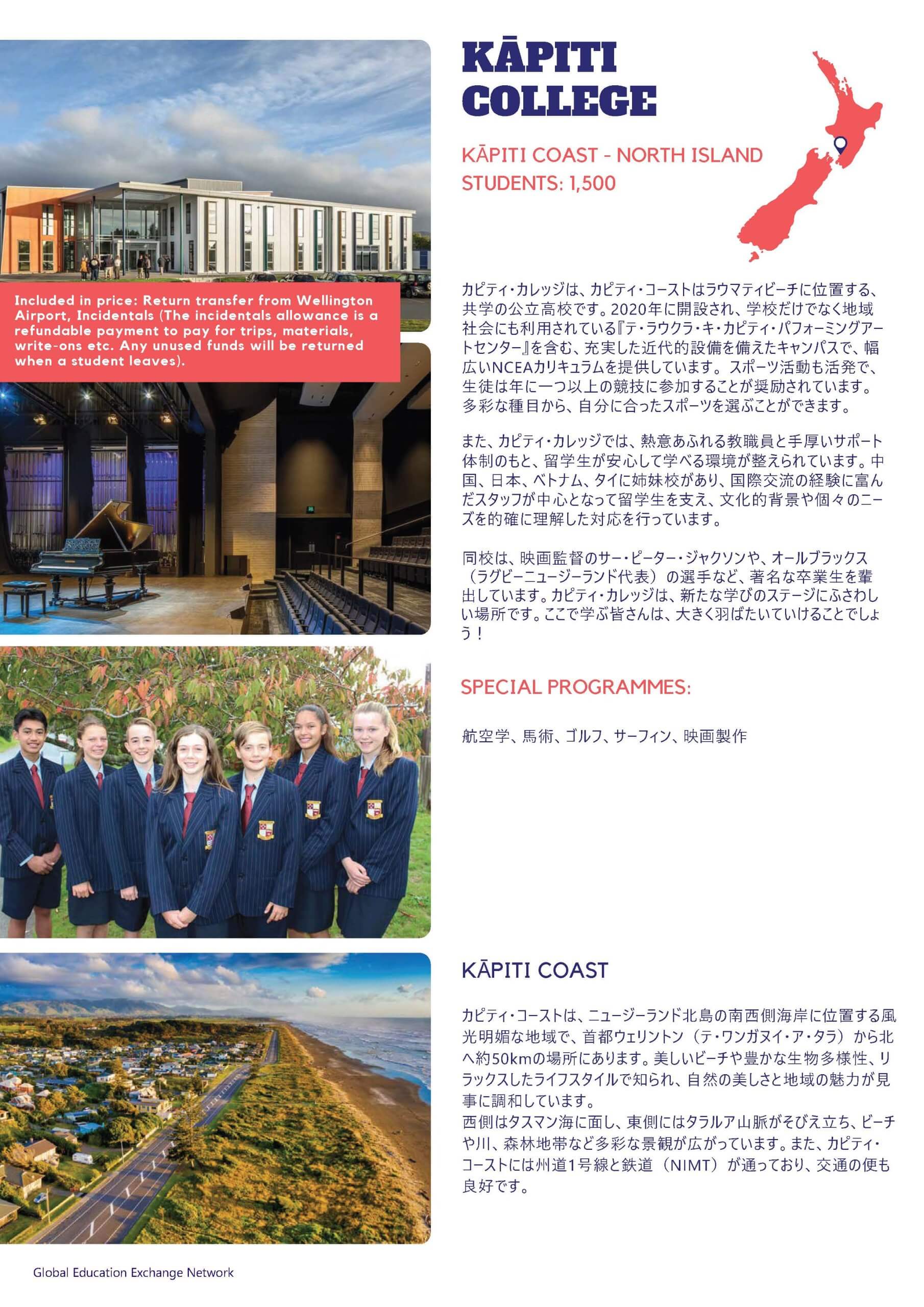 - 学校に付属する約10億円で設立したパフォーミング・アート・センター(Te Raukura ki Kāpiti)を有し、音楽・演劇・舞台活動に最適